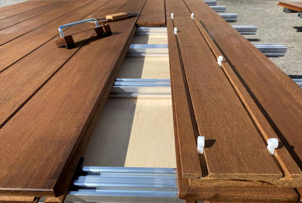 Our mechanical locking allows a secure, screw-free deck surface and full accessibility at any time with a single spatula. Our system also comes with an enhanced aluminium support structure that improves stability and loading capacity.